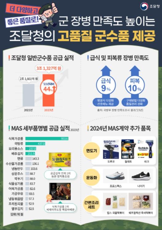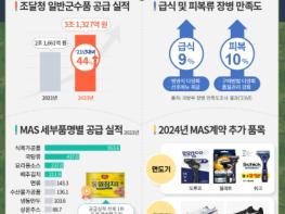 지난해 급식류 다수공급자계약 공급실적은 3,233억 원으로 전년(1,421억 원)보다 127% 증가했고, 올해 역시 8월 기준 3,093억 원을 군에 보급했다. 국방상용쇼핑몰에 등록된 상품 수는 올해 현재(8월 기준) 4,120개로 지난해(2,786개)보다 2배 이상 늘어날 것으로 예상된다.