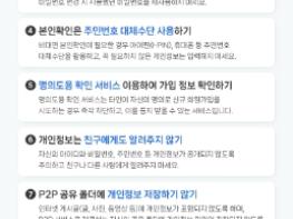 인터넷 게시글(글, 사진, 동영상 등)에 개인정보가 포함되지 않도록 하며, P2P 서비스로 제공하는 자신의 공유 폴더에 개인정보 파일이 저장되지 않도록 주의하세요.