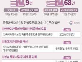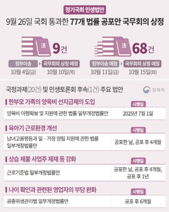 이들 법률은 견해 차가 크지 않은 민생 법안을 신속하게 처리하기로 여야가 합의함에 따라 지난 9월 26일 국회를 통과했다. 77건의 민생 법안은 10월 4일과 11일 두 차례에 걸쳐 정부로 이송되어, 10월 10일과 15일 국무회의에 상정될 예정이다. 이들 법률의 주요 제ㆍ개정 사항은 다음과 같다.
