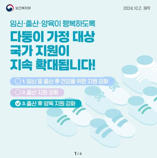 2자녀(쌍둥이 포함) 이상 가구에 대한 돌봄서비스, 본인부담금 할인 적용 등 정부 지원을 확대했습니다.?부모 모두 육아휴직 중이라도 쌍둥이 이상 출산한 가정의 경우 양육공백으로 인정하고 아이돌보미를 지원합니다. (’24.1.~)