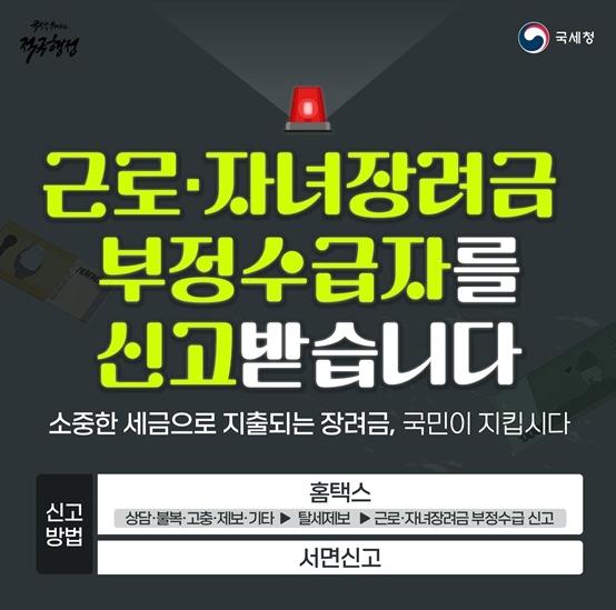 [한국쇼핑몰뉴스, 최영진기자] 근로·자녀장려금 부정 수급자와 부정 수급을 도운 사람 모두 신고 대상입니다.
