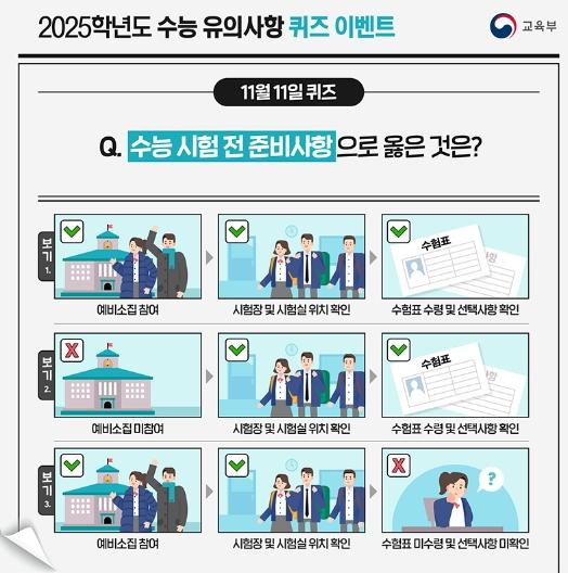 [한국쇼핑몰뉴스, 최영진기자] Q. 수능 시험 전 준비사항으로 옳은 것은?