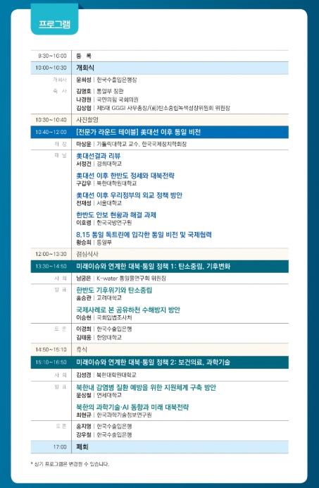 이 자리에서는 한국국제정치학회 회장인 마상윤 가톨릭대학교 교수의 사회로 새로운 미 행정부의 주요 정책 변화가 한반도 통일 환경에 어떤 영향을 미칠지에 대하여 다각도로 조망할 예정이다.