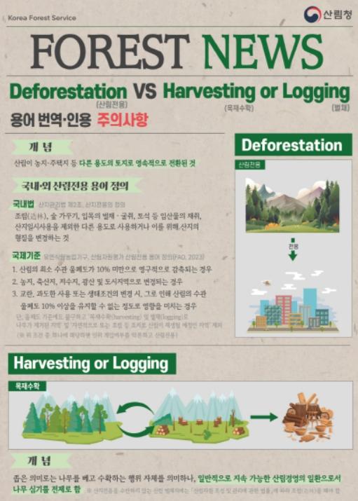 이와 관련해 ‘산림전용(Deforestation)’ 용어는 산업계에 영향이 있는 용어인 만큼 산림벌채 등으로 오번역되어 혼란을 주지 않도록 반드시 ‘산림전용’으로 올바르게 번역해 사용해야 한다.