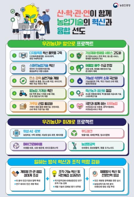 농업 주요 정책을 기술적으로 뒷받침하고 농업·농촌 당면 현안을 신속하게 해결하기 위해 ‘정책지원·현안해결 10대 프로젝트(우리농UP 앞으로)’를 추진한다.