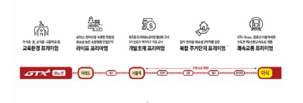 향후 GTX-B노선 개통 시 마석역에서 청량리역까지 21분대(예정), 서울역까지 27분대(예정)로 접근이 가능하여, 교통환경을 비롯한 정주 여건 개선 및 지역경제 활성화가 기대된다.