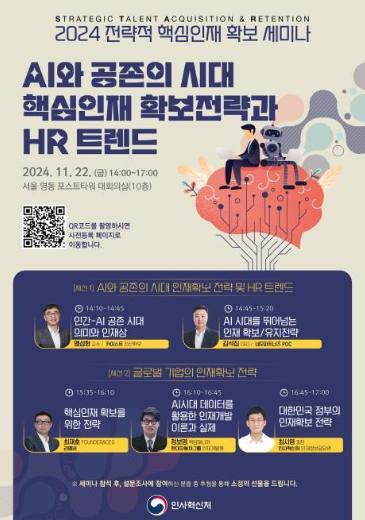 인사혁신처는 22일 서울 포스트타워에서 공공·민간·학계의 인사·조직 전문가 및 담당자 등이 참여하는 ‘2024 전략적 핵심인재 확보 발표회(세미나)’를 개최했다고 밝혔다.