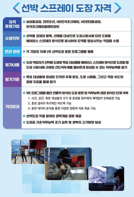 이번 선포식에서는 조선사의 선박도장자격을 제1호 사업주자격으로 인정하기 위한 협약식도 함께 열렸다. 선박도장 직무는 비용?안전?환경 문제로 기존에는 실제 현장에서 훈련하는 데 어려움이 많았다. 이를 해소하기 위해 조선업계는 2년 전부터 가상현실(VR) 기술을 활용한 프로그램을 도입하여 근로자들이 안전하게 훈련한 후 빠르게 현장에 투입될 수 있도록 개선했다. 조선사들은 이 훈련과정을 체계적으로 평가하고 자격증을 부여하는 기준을 만들고 있으며, 정부 인정을 통해 자격이 업계 전반에서 통용되도록 노력하고 있다.