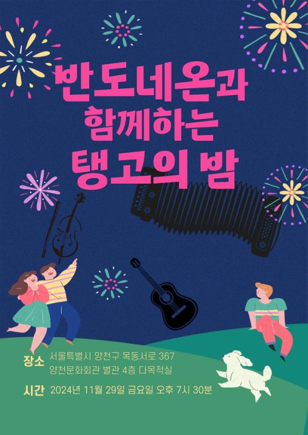 [한국쇼핑몰뉴스, 최영진기자] 깊어가는 가을밤, 매혹적인 탱고 선율로 물들일 특별한 공연이 찾아온다. 반도네오니스트 최예슬은 오는 11월 29일 양천문화회관 별관 4층 다목적실에서 '반도네온과 함께하는 탱고의 밤' 공연을 개최한다.