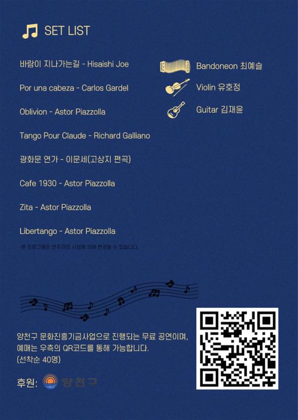 이번 공연은 양천구 문화진흥기금사업의 일환으로 기획됐으며, 최예슬이 직접 기획하여 바이올린, 클래식 기타와 함께 탱고 음악의 진수를 선보일 예정이다.
