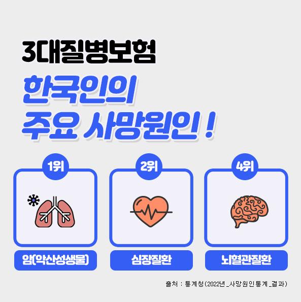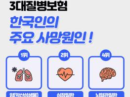 [한국쇼핑몰뉴스, 최영진기자] 흔히 3대질병이라 일컫는 암, 심혈관질환, 뇌혈관질환은 통계청 발표자료에 따르면 한국인의 주요 사망원인 중에서 3위 폐렴을 제외하고 1~4위를 차지하고 있으며, 이전부터 지금까지도 살면서 가장 먼저 대비해야 하는 치명적인 질병으로 강조되고 있다. 이러한 중대질병에 대비하기 위하여 상기 세가지 치명적인 질병을 집중보장하는 3대질병진단비보험을 많이 가입하고 있다. 3대진단비보험은 각각의 질병을 중점적으로 보장하면서도 가입자 특성에 맞는 특약을 추가함으로써 종합건강보험으로도 활용할 수가 있다.