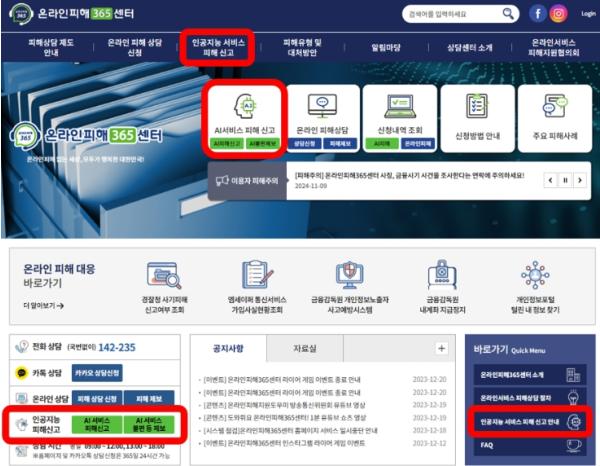 (AI 피해 신고) 이용자는 365센터 홈페이지 메인화면 상단 메뉴 중 'AI 서비스 피해신고' 'AI피해신고' 버튼을 클릭하여 피해를 신고할 수 있다. 또한, AI 피해 신고 전에 365센터 전화 및 카카오톡 채널을 이용하여 피해 신고 절차 등 관련 상담을 받을 수 있다.