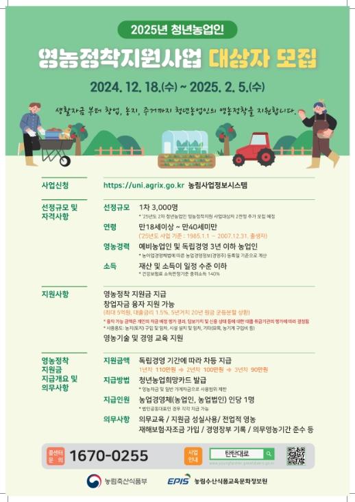 [한국쇼핑몰뉴스, 최영진기자] 농림축산식품부는 12월 18일부터 ?2025년 청년농업인 영농정착지원사업? 대상자 선발을 위한 1차 모집을 시작했다.
