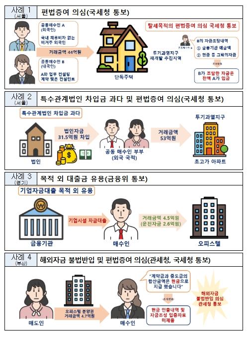 (사례 1) 공동매수인 A·B(A는 국내 체류비자가 없는 비거주 외국인, B는 우리나라 국적자로서 A와 업무 컨설팅 계약을 맺은 컨설턴트)는 투기과열지구 내 재정비촉진지구의 단독주택을 44억원에 매수. B는 금융기관 예금액 4억원과 현금 4.3억원으로 자금 일부를 조달했다고 소명했으나, B의 현금을 A가 입금하는 등 탈세목적의 편법증여가 의심되어 국세청 통보 예정
