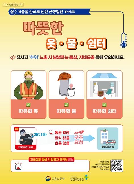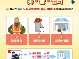 이와 함께, 겨울철 한파에 장시간 노출되면 저체온증, 동상 같은 한랭질환, 뇌심혈관질환 등이 발생할 수 있으므로 한랭질환 3대 기본수칙을 안내하고, 기저질환자(고혈압, 당뇨 등), 고령자 등에 대해서는 세심한 관리를 하도록 지도한다.