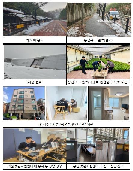 ‘통합지원센터’(12.2.~, 안성·용인·이천시)는 중앙부처, 자치단체, 유관기관이 협업해 피해주민 대상 ?복구자금 융자 및 세금 유예 ?피해시설 재·개축 절차 ?법률 자문 등 570여 건의 원스톱 상담 서비스를 제공했다.
