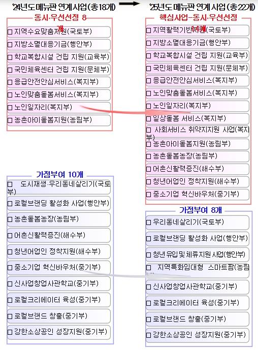 이번 공모의 연계 지원사업은 ’24년 18개에서 스마트팜 등 22개로 대폭 확대됐으며, 기반시설 조성 지원 대상은 기존 성장촉진지역에서 7개 도 120개 시군 전체로 확대됐다.