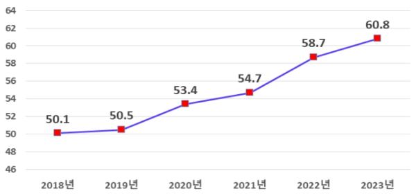 전체 평균은 60.8점(가점 제외)으로 지난 조사의 58.7점 대비 2.1점 상승했다. 모든 지역에서 근로시간이 감소하고 대부분의 지역에서 ‘초과근로 감소’(12개), ‘휴가 사용기간 증가’(10개), ‘유연근무 도입률’(10개)이 증가하며 ‘일’ 영역 점수가 0.5점 증가했다. ‘일·생활 균형 관련 홍보·교육·컨설팅 경험 사업체 비율’이 증가(10개)하여 ‘지자체 관심도’ 영역 점수도 1.4점 증가했다.