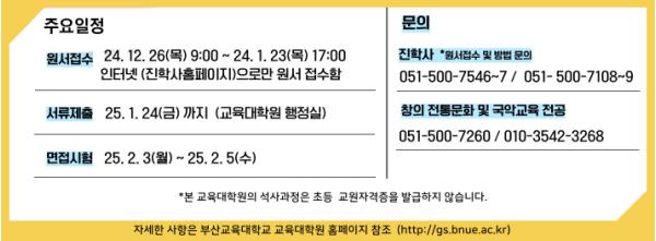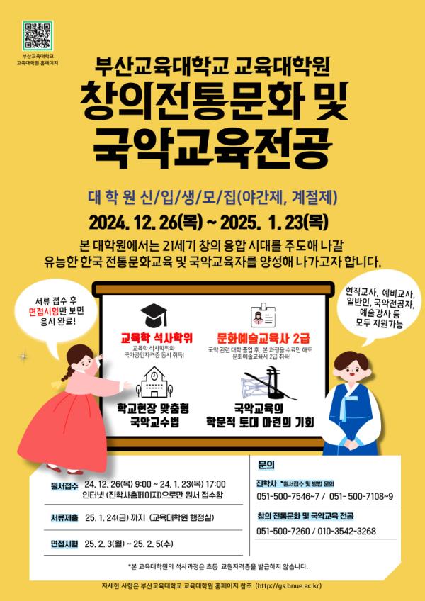 [한국쇼핑몰뉴스, 최영진기자] 부산교육대학교 교육대학원이 창의적 전통문화 교육과 국악교육의 미래를 이끌어갈 인재 양성을 위해 ‘창의전통문화 및 국악교육전공’ 신입생 모집을 실시한다.