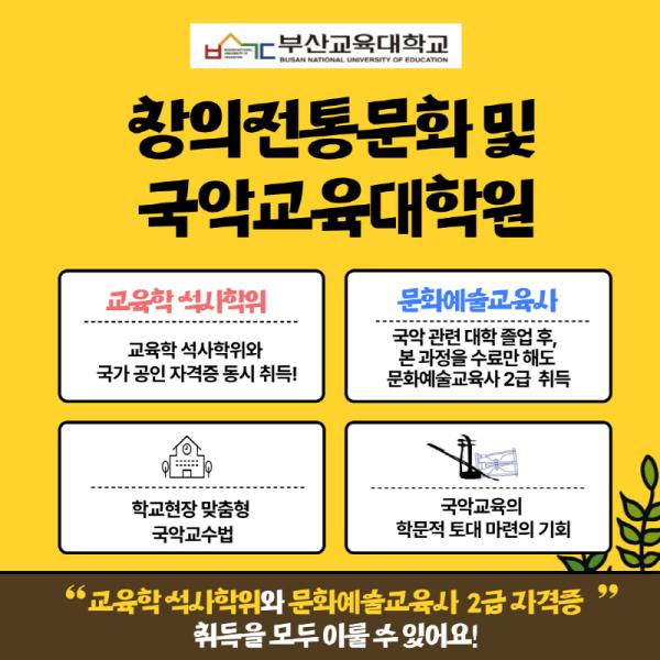 부산교육대학교 교육대학원의 창의전통문화 및 국악교육전공은 예비 교사, 현직 교원, 국악공연자, 문화예술 강사 등 전통문화 교육에 관심 있는 누구나 지원할 수 있으며, 창의적 융합 시대를 선도할 교육자와 연구자로 성장할 수 있는 최고의 환경과 지원이 마련되어 있다.