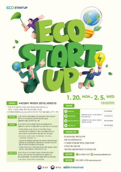 모집 대상은 녹색산업분야에 진출해 있거나 진출할 계획이 있는 예비창업자나 7년 이내 창업기업(공고일 기준)이며, 에코스퀘어 누리집을 통해 온라인으로 신청할 수 있다. 자세한 사업공고는 환경부 및 특허청 등의 누리집에서 확인할 수 있다.