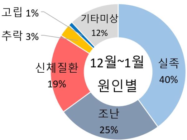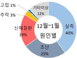 연말연시 등산사고 원인으로 실족(40%)과 조난사고(26%)가 가장 많지만, 1월 1일에는 실족(37%) 다음으로 신체질환(28%)이 많아 산행 시 체력 안배에도 주의가 필요하다.