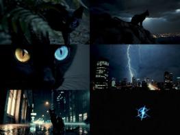 먼저 리더 필름 영상에는 검은 고양이가 비 내리는 숲속에서 걸어 나와 천둥 치는 도시 한복판에 멈춰서는 모습이 담겼다.