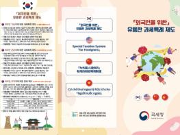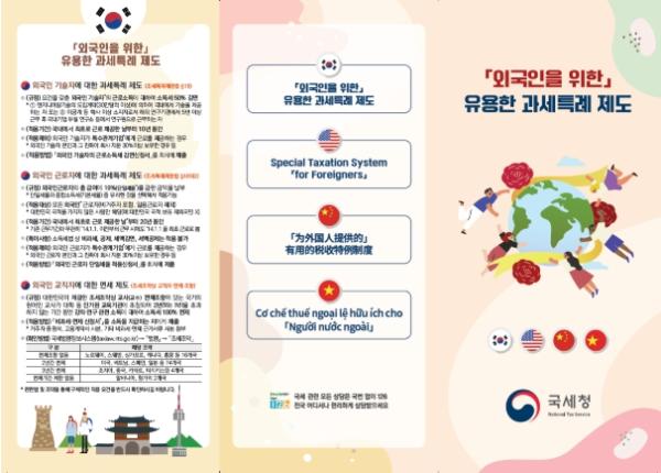 특히, 올해는 외국인만을 대상으로 적용되는 과세특례 제도의 주요 내용을 담은 리플릿을 4개 국어(한국어・영어・중국어・베트남어)로 제작하여, 각 세무서 민원실 및 대사관·외국인 근로자 지원센터 등 유관기관에 배포했다.