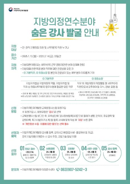 최종 선정된 강사는 자치인재원 ‘지방의정 연수분야’ 강사풀에 등록해 강의 시간을 배정하는 한편, 전국 각 지방의회 자체 연수 진행 시 강사로도 추천할 예정이다.