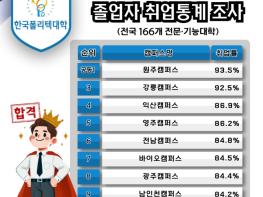 특히 원주캠퍼스는 93.5%의 취업률로 전국 166개 전문·기능대학 중 공동 1위에 이름을 올렸다. 그밖에 ▲강릉(92.5%) ▲익산(86.9%) ▲영주(86.2%) ▲전남(84.8%) ▲바이오(84.5%) ▲광주(84.4%) ▲남인천(84.2%) ▲창원(83.8%) 등 8개 캠퍼스가 3위부터 10위까지 취업률 상위 10위권에 연이어 포진했다.