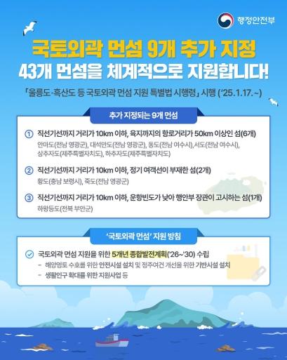 [한국쇼핑몰뉴스, 최영진기자] 국토외곽 먼섬 9개가 추가 지정되어, 총 43개의 먼섬을 체계적으로 지원합니다!