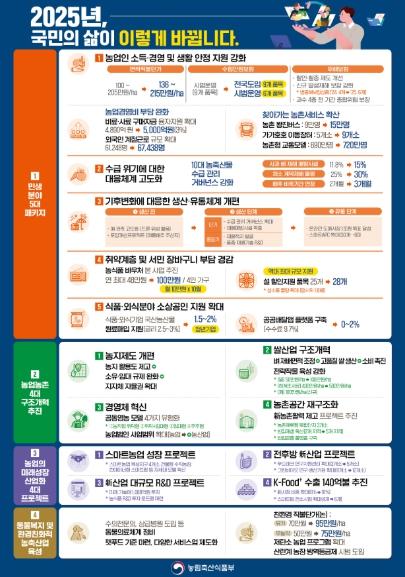 먼저, 농식품부는 대내외 불확실성 확대, 내수 부진 등 어려운 민생 여건을 고려하여 농식품 5대 민생 안정 패키지를 중심으로 농업인과 국민의 삶을 안정시키는 데 총력을 다한다. 아울러, 농업·농촌 전반의 구조개혁과 함께 새로운 성장모델을 만들어 나간다. 농지, 쌀 산업 등 농업·농촌 4대 구조개혁을 본격화하고, 미래 세대를 준비하기 위한 新산업 4대 혁신 프로젝트와 동물복지 및 환경친화적 농축산업에 집중적으로 투자한다.