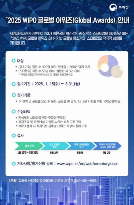 [한국쇼핑몰뉴스, 최영진기자] 특허청은 1월 15일부터 세계지식재산기구(WIPO)가 '2025 글로벌 어워즈(Global Awards)' 참가기업 모집에 들어갔다고 밝혔다.