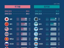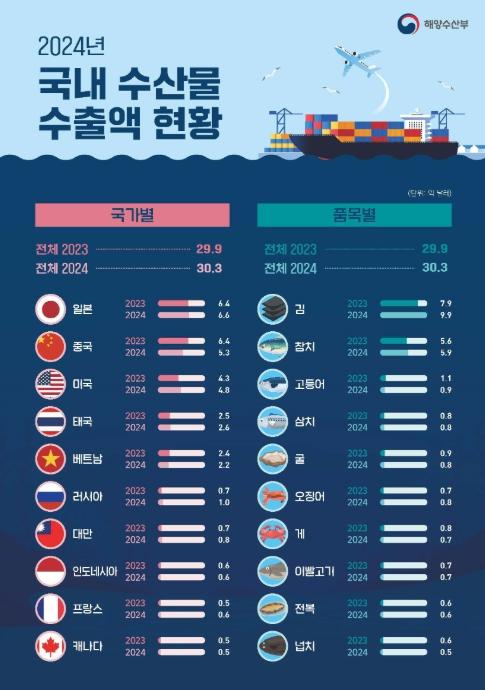 [한국쇼핑몰뉴스, 최영진기자] 해양수산부는 2024년 수산식품 수출 총액이 30.3억 달러(전년 대비 +1.2%)를 기록했다고 밝혔다. 주요 품목의 수출액은 수출 1위 품목인 김이 997백만 달러(1.3조 원)를 기록하여 2년 연속 1조 원을 달성했다. 뒤를 이어 수출 2위 품목인 참치는 전년 대비 4.7% 증가한 589백만 달러를 기록했다.