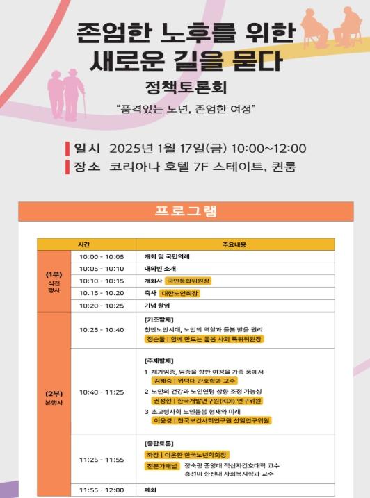 [한국쇼핑몰뉴스, 최영진기자] 대통령 직속 국민통합위원회는 1월 17일 10시 코리아나 호텔에서 대한노인회, 한국노년학회와 함께 '존엄한 노후를 위한 새로운 길을 묻다'라는 주제로 정책토론회를 개최했다.