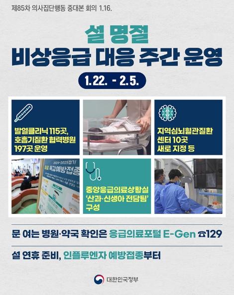 [한국쇼핑몰뉴스, 최영진기자] 정부는 16일 제85차 의사 집단행동 중대본 회의를 열고 '설 연휴 대비 응급의료체계 유지 특별대책'을 논의했습니다. 1월 22일부터 2월 5일까지 2주간을 '설 명절 비상응급 대응 주간'으로 지정하고 응급의료를 안정적으로 유지할 수 있도록 대책을 적극 추진합니다.