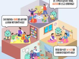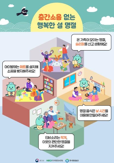 설 연휴 발생할 수 있는 층간소음 예방을 위한 홍보도 진행한다. ‘층간소음 이웃사이센터’에 접수되는 민원 유형의 69%가 ‘뛰거나 걷는 소리’로 나타났다. 이에, 모두가 배려하는 층간소음 갈등 없는 설 연휴를 위해 층간소음 저감 생활수칙* 홍보 포스터를 전국 아파트 게시판에 부착하고, 홍보 영상도 아파트 엘리베이터 내에 송출할 계획이다.