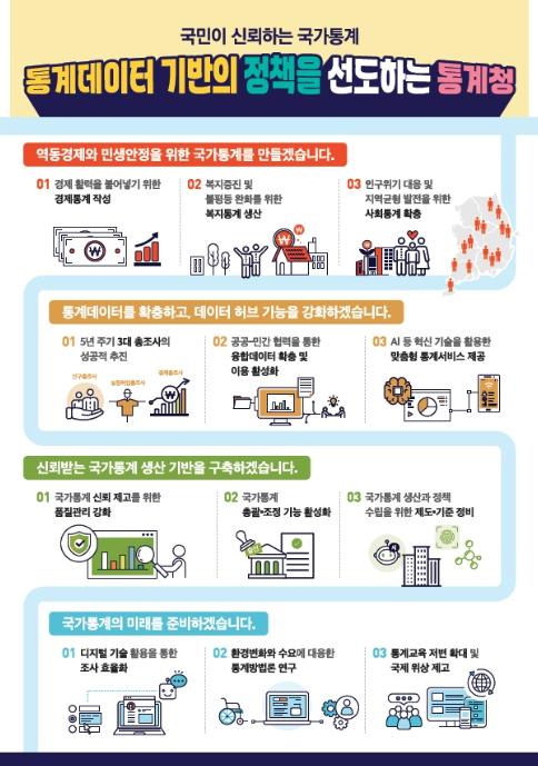 “국민이 신뢰하는 국가통계, 통계데이터 기반의 정책을 선도하는 통계청”을 비전으로 네 가지 핵심 과제를 선정하여 추진하기로 했다.