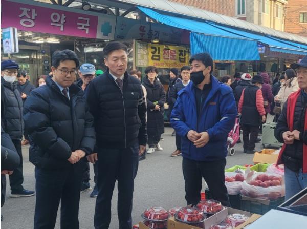 함께 현장을 찾은 김성섭 중기부 차관은 신영시장 내 청과, 축산 등 점포를 둘러보며 “전통시장 활성화를 위해 관계부처와 디지털 온누리상품권 할인판매와 특별 할인전, 환급행사, 과일 선물세트 직공급 등 다양한 협업사업을 추진하고 있는데, 이러한 노력들이 우리 전통시장을 찾는 마중물 역할을 톡톡히하여 보다 풍성한 설 명절이 됐으면 한다.”라며, “이번 설 명절에도 온누리상품권을 구매하여 고향의 전통시장을 많이 방문하셔서 지역경제에도 보탬이 되는 정겹고 풍성한 명절을 보내시길 바란다.”라고 밝혔다.