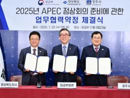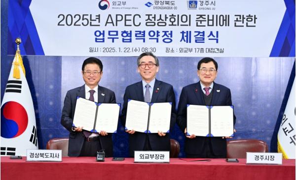 [한국쇼핑몰뉴스, 최영진기자] 조태열 외교부 장관(2025 APEC 정상회의 준비기획단 공동단장), 이철우 경상북도 도지사, 주낙영 경주시장은 1월 22일 오전 정부서울종합청사 별관에서 '2025 APEC 정상회의 준비에 관한 외교부, 경상북도, 경주시간 업무협력 약정서'를 체결했다.