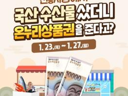 전국 158개 전통시장에서 국산 수산물을 구매하시면 1인당 최대 2만 원 한도로 온누리상품권을 돌려드립니다.