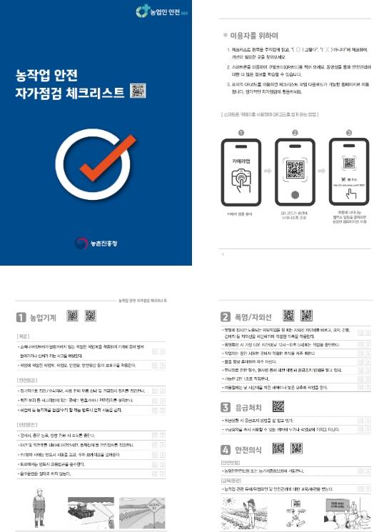 이 가운데 농작업 안전 자가 점검 목록표는 농장주·외국인 근로자가 농작업 중 안전사고 예방과 재해관리를 위해 반드시 알아야 할 정보와 실내외 작업장의 안전 상태를 스스로 확인할 수 있도록 만들었다.