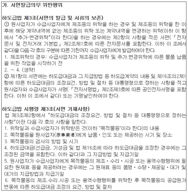 하도급법이 법정기재사항을 적은 서면을 작업을 시작하기 전에 발급하도록 규정한 것은 원사업자와 수급사업자간의 권리와 의무사항을 분명히 하여 장래에 발생할 수 있는 분쟁을 사전에 예방하고 원사업자의 자율적인 법 준수를 확보함과 아울러 분쟁의 해결을 용이하게 하는 데 그 목적이 있다.