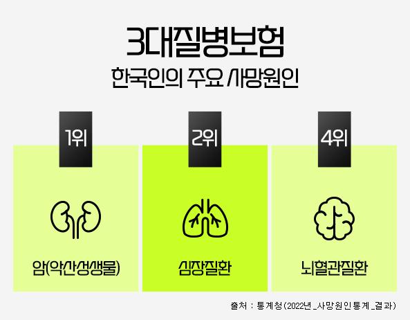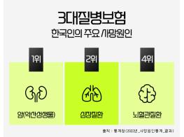 [한국쇼핑몰뉴스, 최영진기자] 흔히 3대질병이라 일컫는 암, 심혈관질환, 뇌혈관질환은 통계청 발표자료에 따르면 한국인의 주요 사망원인 중에서 3위 폐렴을 제외하고 1~4위를 차지하고 있으며, 이전부터 지금까지도 살면서 가장 먼저 대비해야 하는 치명적인 질병으로 강조되고 있다. 이러한 중대질병에 대비하기 위하여 상기 세가지 치명적인 질병을 집중보장하는 3대질병진단비보험을 많이 가입하고 있다. 3대진단비보험은 각각의 질병을 중점적으로 보장하면서도 가입자 특성에 맞는 특약을 추가함으로써 종합건강보험으로도 활용할 수가 있다.