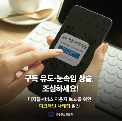 [한국쇼핑몰뉴스, 최영진기자] 의도치 않은 결제를 유도하거나 중요한 정보를 숨기는 등의 '다크패턴(dark patterns)' 눈속임 상술에 대한 구체적 실사례를 담은 책자가 발간됐습니다.