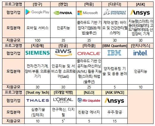 이번 모집 공고는 ①창구(구글플레이 협업, 모바일 서비스 분야), ②엔업(엔비디아 협업, 인공지능 분야), ③마중(마이크로소프트 협업, 클라우드 기반 기업 대 기업(B2B) 해법(솔루션) 분야), ④다온다(다쏘시스템 협업, 제약·생명(바이오) 및 건강관리(헬스케어) 분야), ⑤ASK(앤시스코리아 협업, 지능형(스마트) 이동수단(모빌리티), 심층기술(하이테크), 산업장비, 기계 분야), ⑥지중해(지멘스 협업, 전자·전기·기계, 장비·부품, 의료용 기기 분야), ➆정글(아마존 웹 서비스 협업, 인공지능 및 서비스형 소프트웨어(SaaS) 분야), ➇미라클(오라클 협업, 클라우드 기반 인공지능/머신러닝(AI/ML) 활용 지능형(스마트) 해법(솔루션) 분야), ➈IBM Quantum(IBM 협업, 양자컴퓨팅 기술 및 응용 분야), ⑩인지니어스(인텔 협업, 인공지능 분야), ⑪Trust my Tech(탈레스 협업, 심층기술(딥테크) 분야), ⑫로레알 빅뱅(로레알코리아 협업, 연구혁신 및 디지털 분야), ⑬N.E.O(에어리퀴드 협업, 친환경 에너지 분야), ⑭ASK 스페이스(앤시스코리아 협업, 우주·항공 분야) 등 총 14개 프로그램으로 구성되며, 공고에 지원을 희망하는 기업은 1개 프로그램을 선택하여 신청할 수 있다.