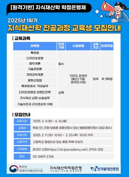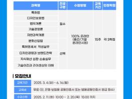 이번 1학기 수업은 3월 4일부터 약 15주간 진행된다. 1학기에는 특허법, 디자인보호법 등 총 12개 과목이 개설되고, 1인당 최대 7개 과목(총 21학점)까지 수강할 수 있다. 수강신청은 지식재산학 학점은행 사이트에서 가능하며, 선착순으로 모집한다.