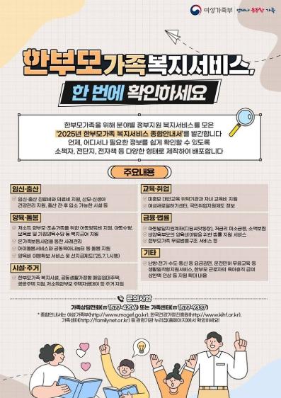 [한국쇼핑몰뉴스, 최영진기자] 한부모가족을 위해 분야별 정부지원 복지서비스를 모은 '2025년 한부모가족 복지서비스 종합안내서'를 발간합니다. 언제, 어디서나 필요한 정보를 쉽게 확인할 수 있도록 소책자, 전단지, 전자책 등 다양한 형태로 제작하여 배포합니다.