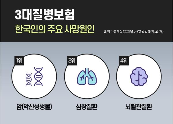 [한국쇼핑몰뉴스, 최영진기자] 3대질병으로 일컬어지는 암, 뇌혈관질환, 심혈관질환은 한국인의 주요 사망원인에서 상위를 차지하고 있으며, 이에 대한 진단비를 집중적으로 보장해 주는 보험상품을 3대질병진단비 보험이라 할 수 있다.