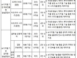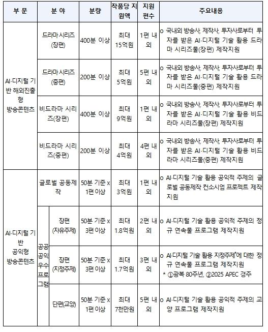 먼저, 해외진출형 방송작품(콘텐츠) 부문은 드라마 및 비드라마 분야에 방송사 자체보유기술 및 실증 사업을 통해 검증된 인공지능·디지털 기술을 적용해 국제 경쟁력을 강화하고, 칸시리즈 등 해외 작품 시장(콘텐츠 마켓)을 통해 방송작품(콘텐츠) 뿐 아니라 관련 인공지능 기술도 해외시장에 동반 진출할 수 있도록 지원할 예정이다.